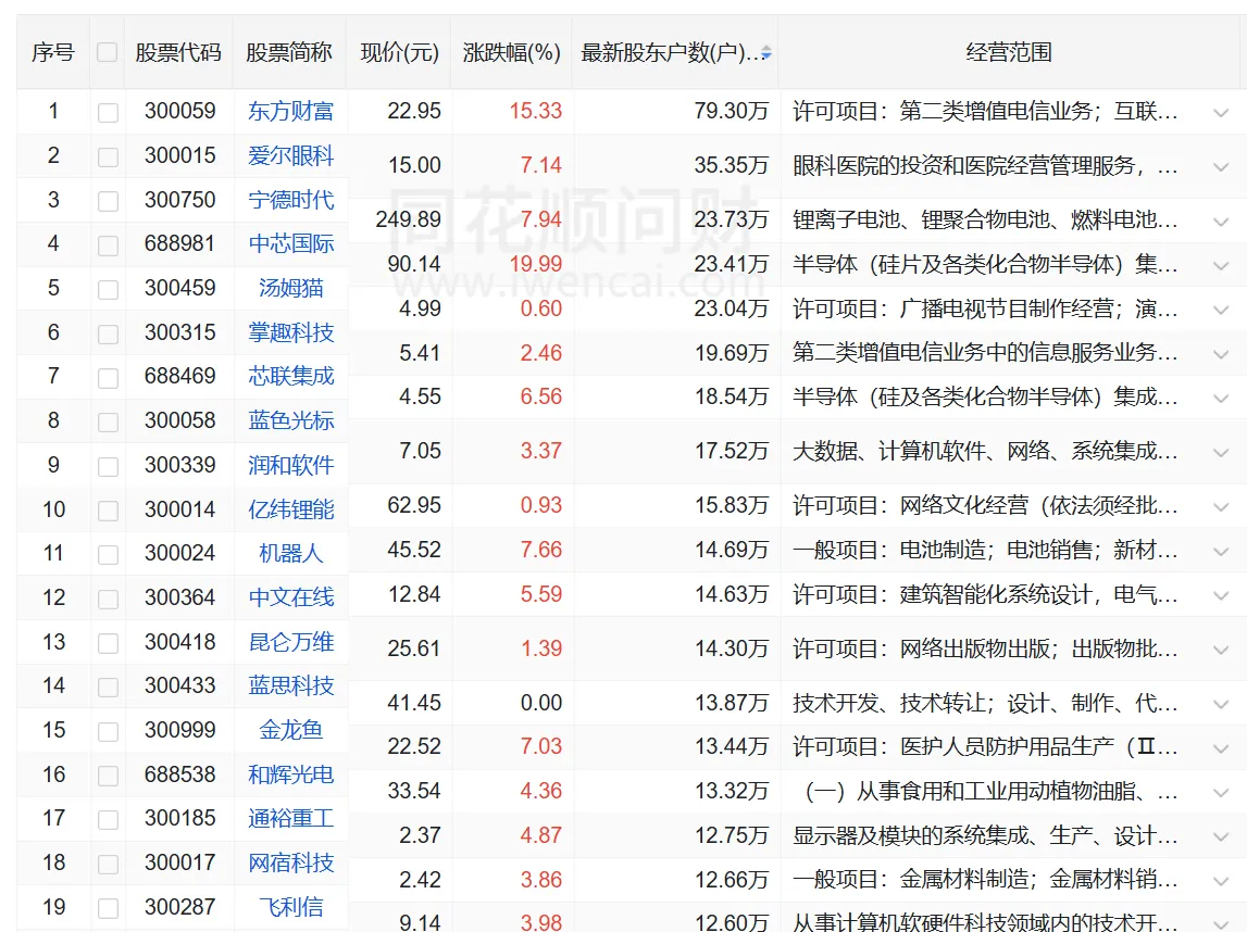 东方财富18 October 2024 / 1 min read东财是明星股中唯一的创业板,排名前50中,另一家是爱尔眼科。由于两年门槛,东财基本代表了老股民。然后是宁德和中芯国际,由于数年熊市,老股民其实是相当饥渴的,但拉这些真的有未来吗?人气 = 实力?