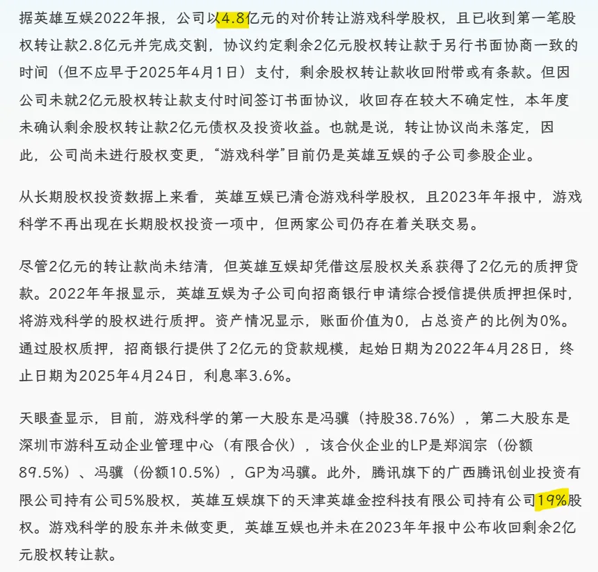 游科估值24 August 2024 / 1 min read4.8亿19%,按这个说法22年就估值25亿了,悟空问世不是身价大增,如果能上市拉到50亿也有可能。英雄互娱没完成交割,可能会留些股权吧。腾讯没多少,不过接下来它肯定会想办法多拿点。